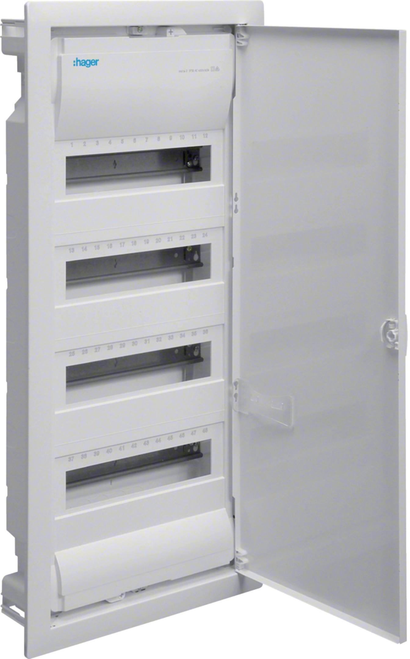 Rozdzielnica instalacyjna podtynkowa Hager Volta przeznaczona jest do montażu aparatury modułowej w instalacjach elektrotechnicznych. Obudowa posiada 4 rzędy z których każdy może pomieścić 12 modułów.