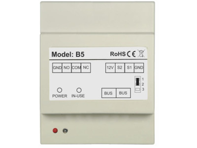 B5 to specjalny moduł przeznaczony do pracy w systemie VIDOS DUO. Posiada funkcję rozszerzenia funkcjonalność systemu o możliwość obsługi drugiego rygla/bramy lub sterowanie oświetleniem. Moduł umożliwia również obsługę rygli wysokoprądowych oraz otwieranie wejścia przy użyciu dodatkowego przycisku zwiernego NO przy wyjściu z posesji.