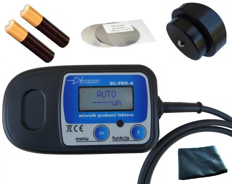 Grubościomierz lakieru GL-PRO-6-FAZ , służy do pomiaru grubości warstwy lakieru nałożonej na blachę samochodową stalową i stalową ocynkowaną i aluminiową. Urządzenie automatycznie wykrywa rodzaj podłoża.