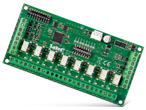 - rozbudowa systemu o 8 wyjść: 8 wyjść niskoprądowych typu OC, do 8 wyjść przekaźnikowych, każde wyjście typu OC połączone równolegle z wyjściem przekaźnikowym, możliwość obniżenia poboru prądu poprzez wyłączenie obsługi wybranych wyjść przekaźnikowych