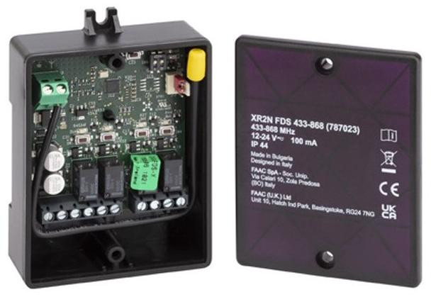 Zewnętrzny odbiornik 2-kanałowy FAAC XR2N FDS 433-868 Mhz z wbudowanym dekodowaniem FDS-SLH-RC-DS w dedykowanej obudowie do użytku zewnętrznego. Idealny wszędzie tam, gdzie chcemy korzystać z nowych pilotów FAAC FDS.